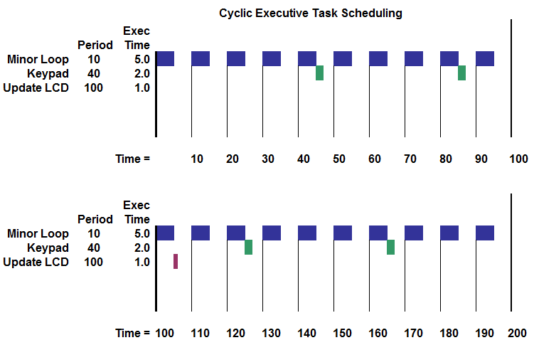 The most critical time for the system is when all three tasks must be performed within the same Minor Loop. This occurs at the Least Common Denominator of the periods of tasks: 200ms, in our example. This is referred to as the Major Loop.